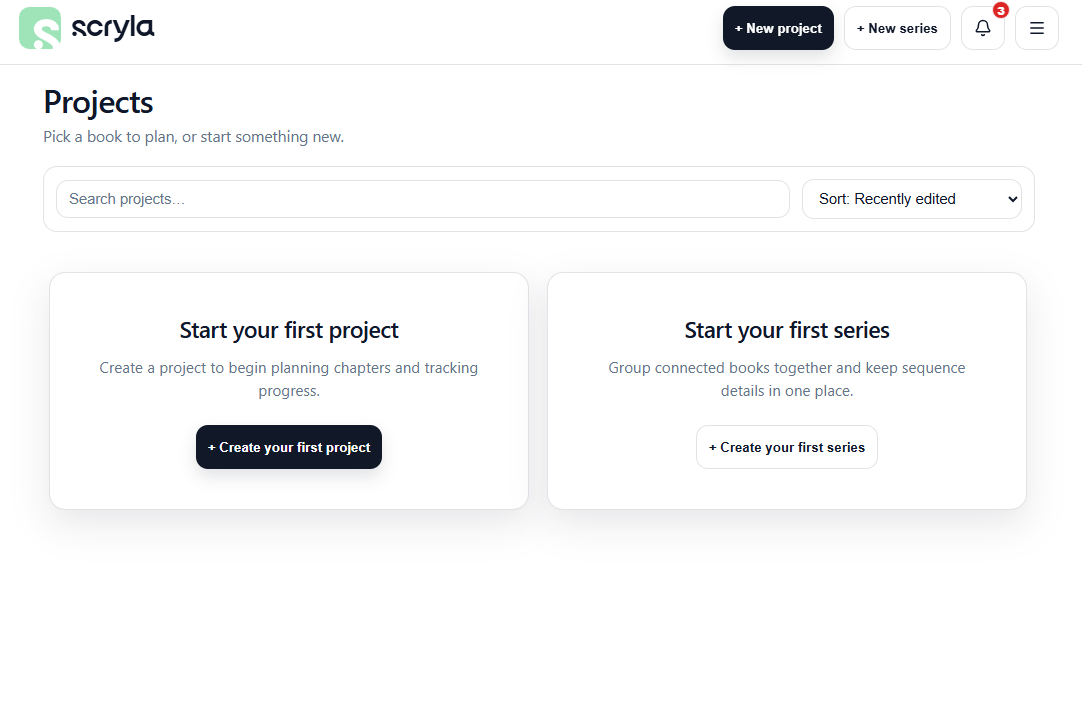A project in Scryla represents a single book, novella, or writing project.